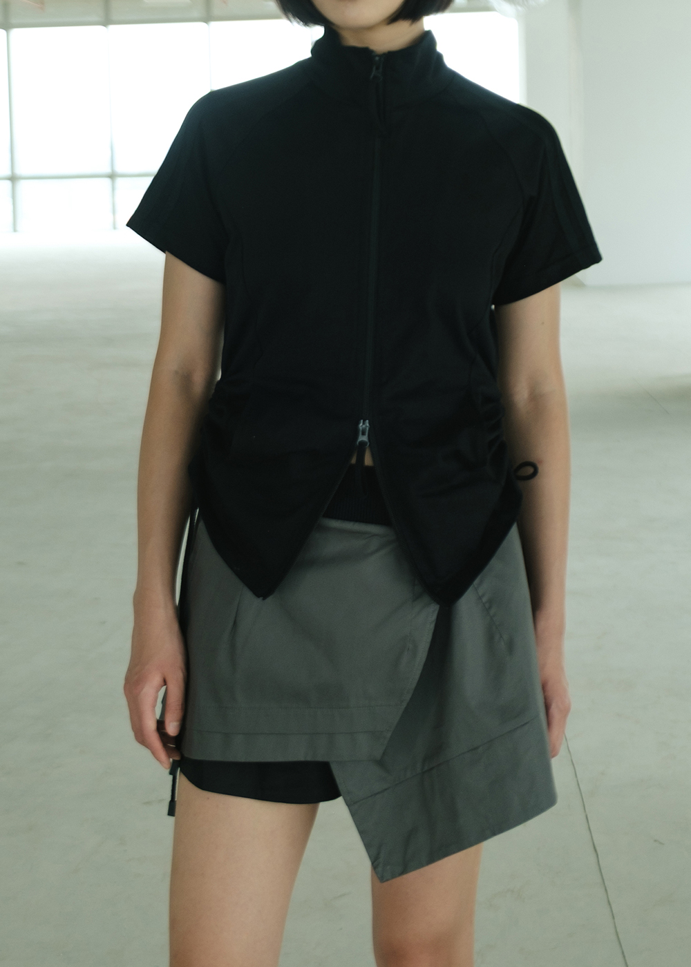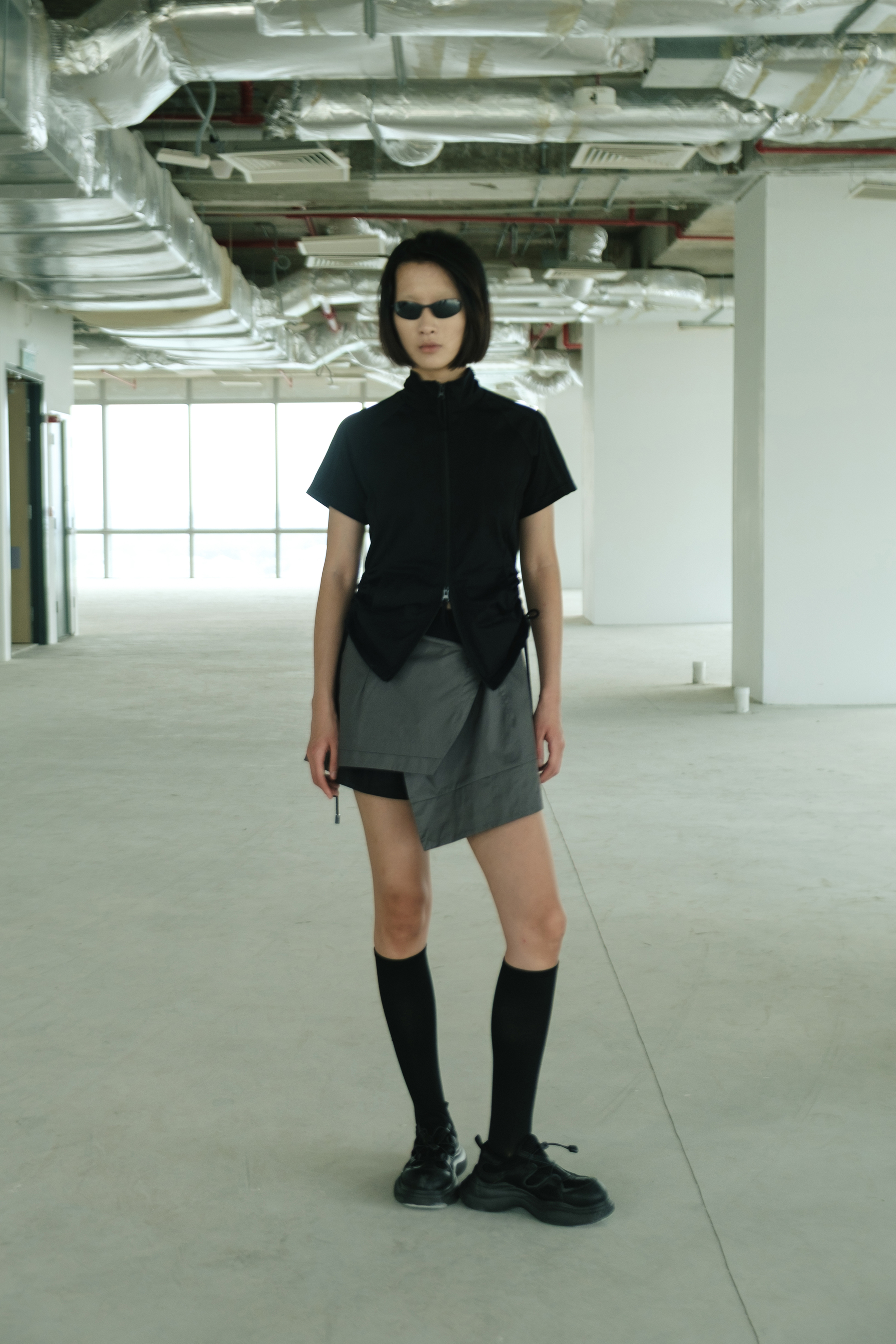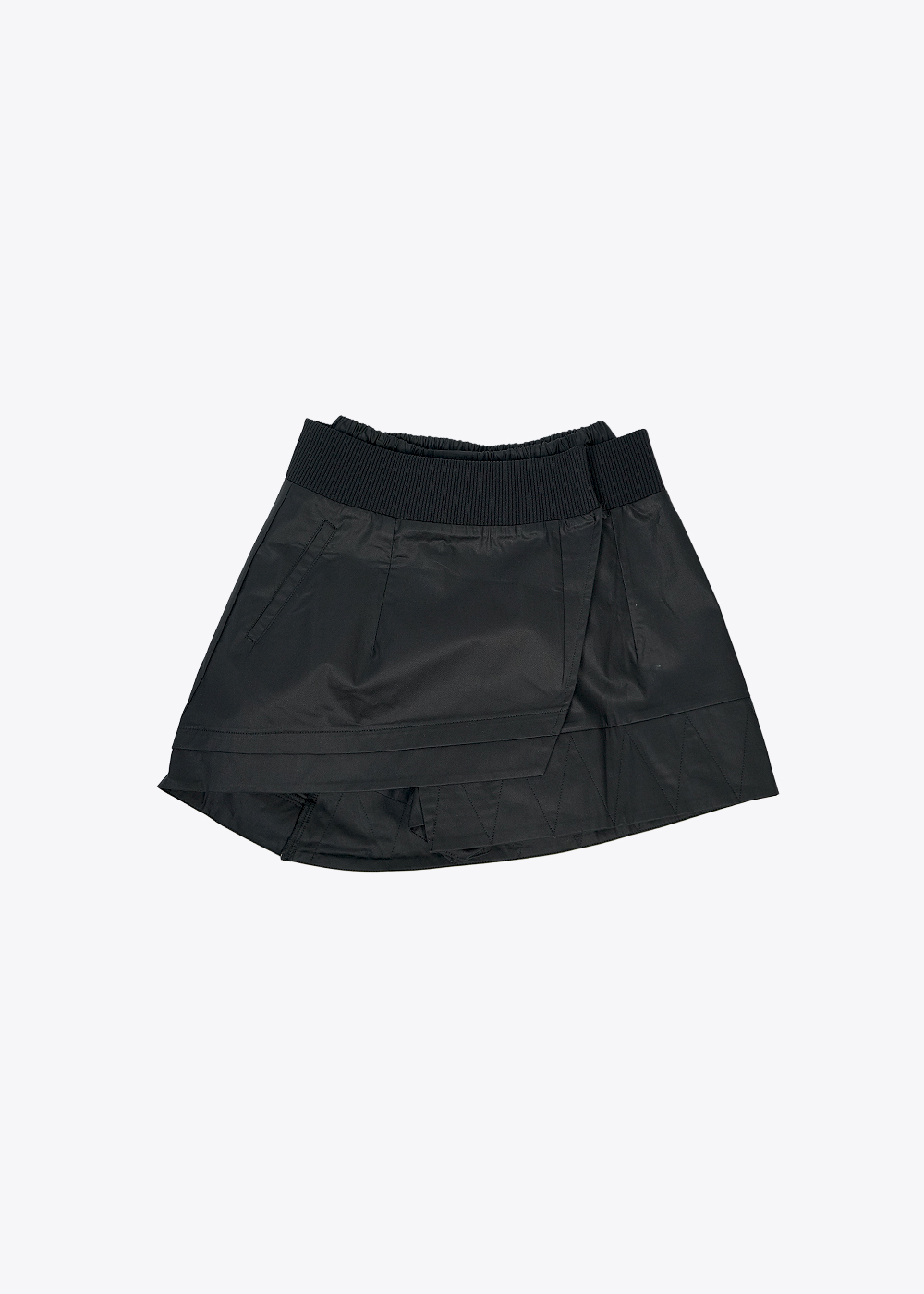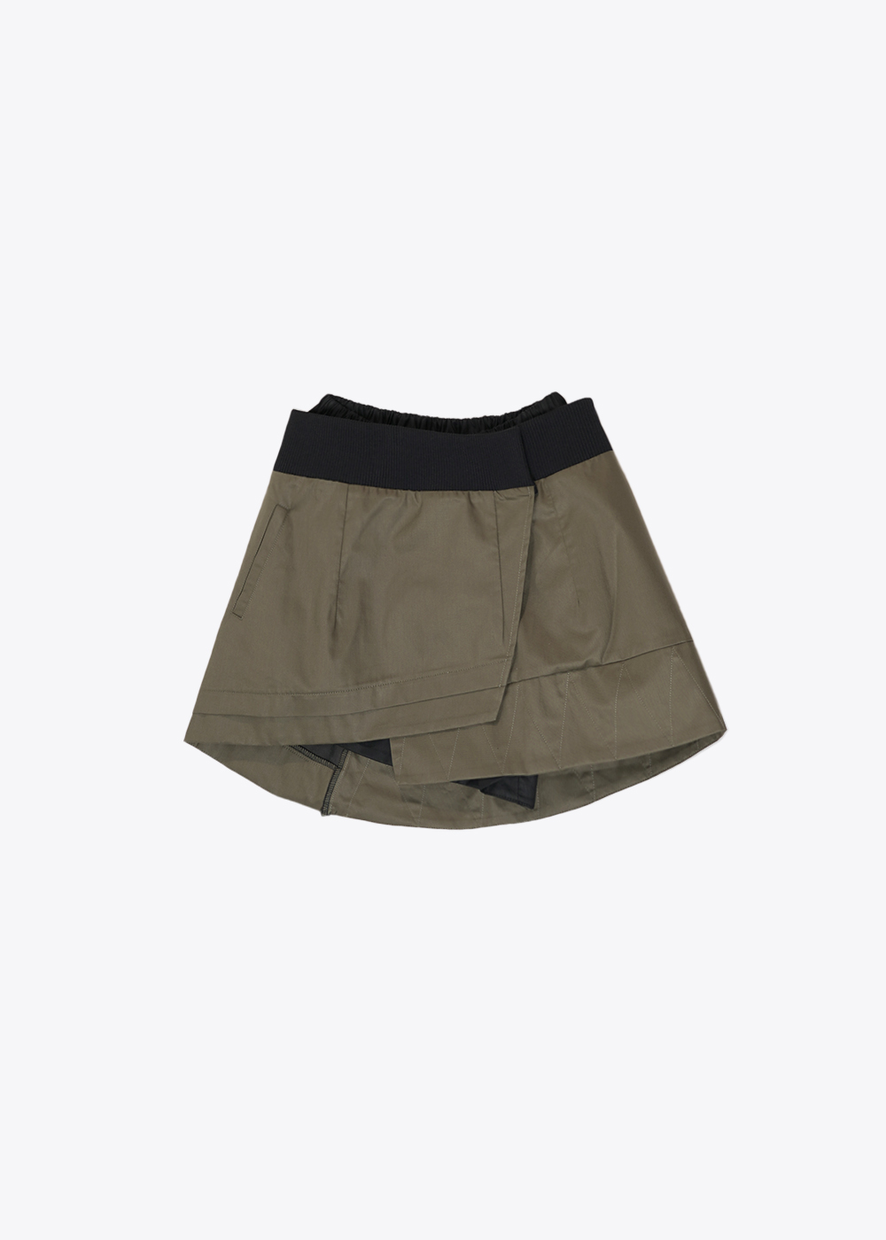 - A two-piece set featuring tailored inner shorts and a detachable wrap skirt with button closure