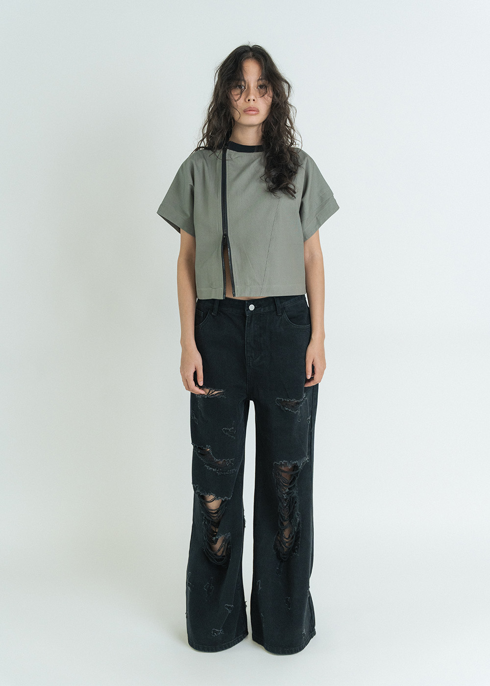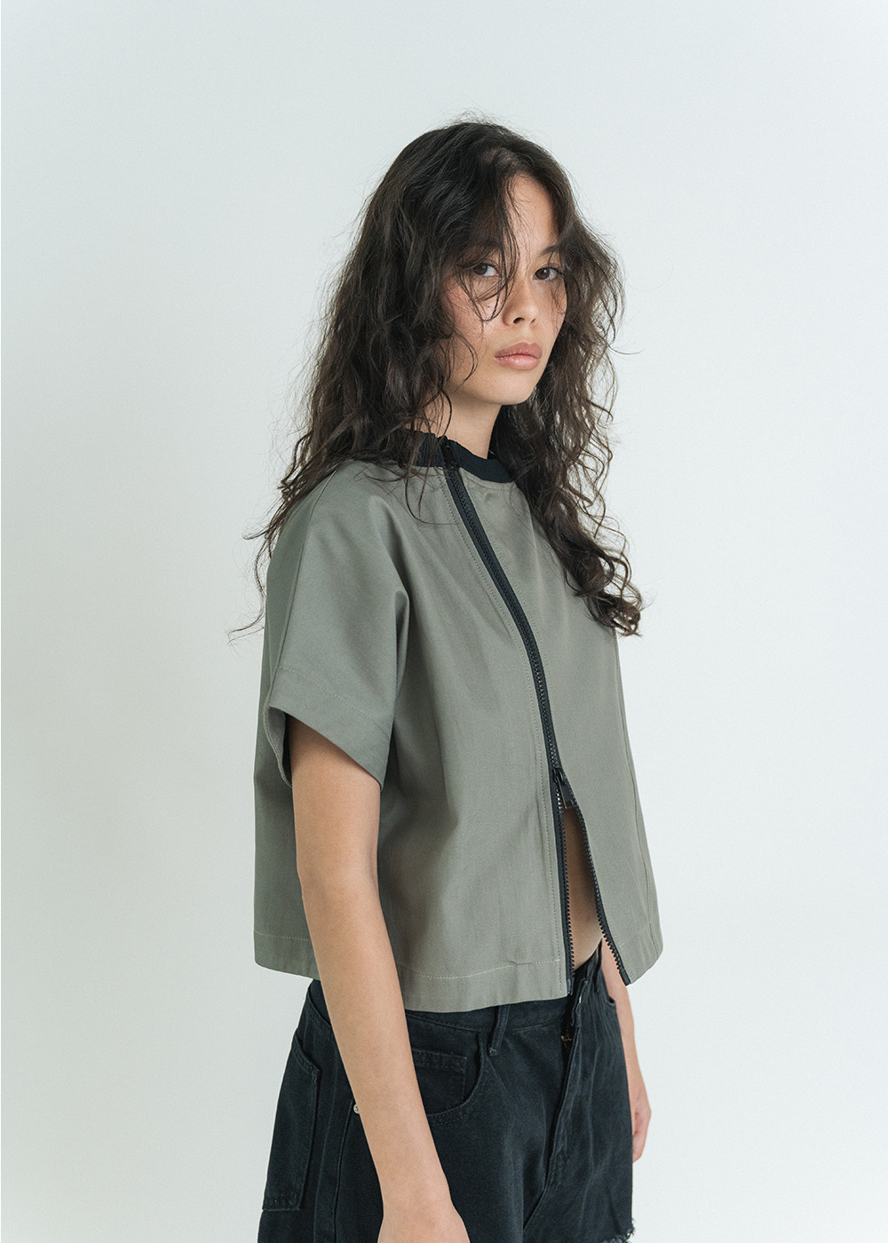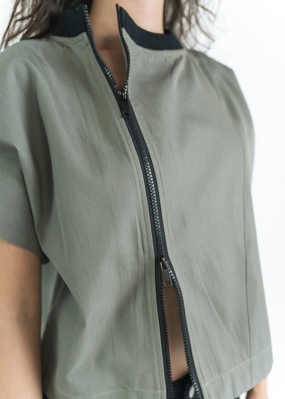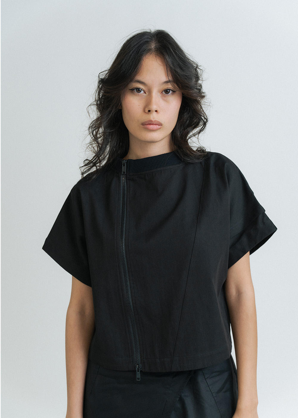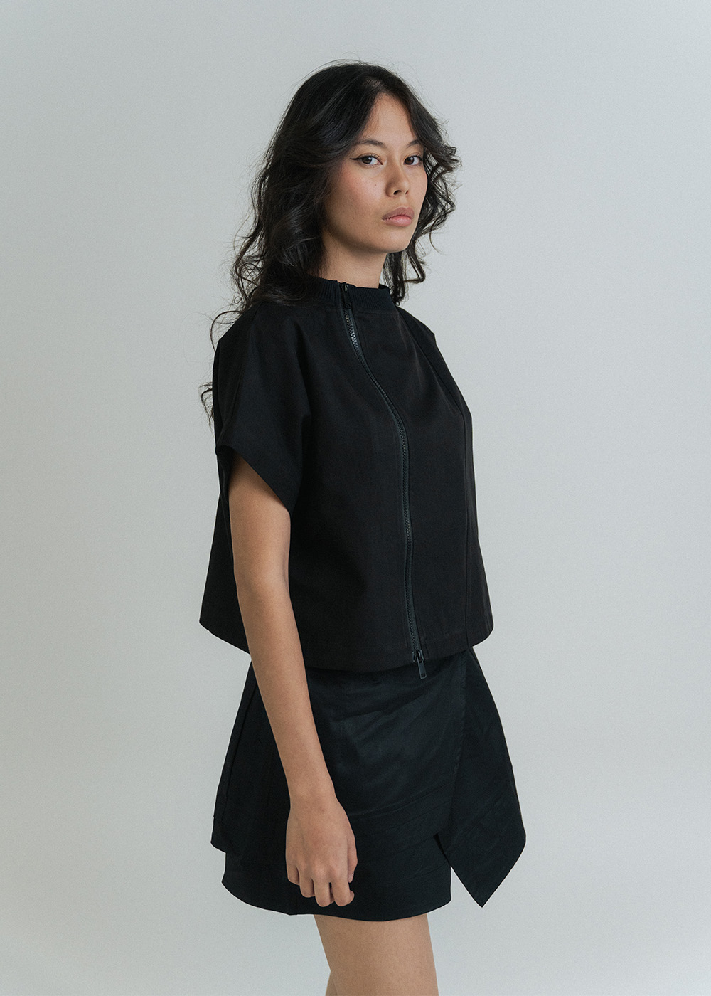 Structured silhouette with asymmetric zip front closure