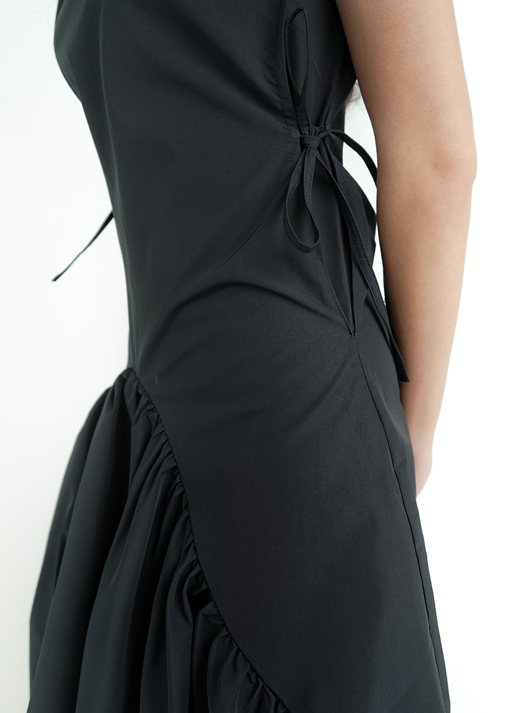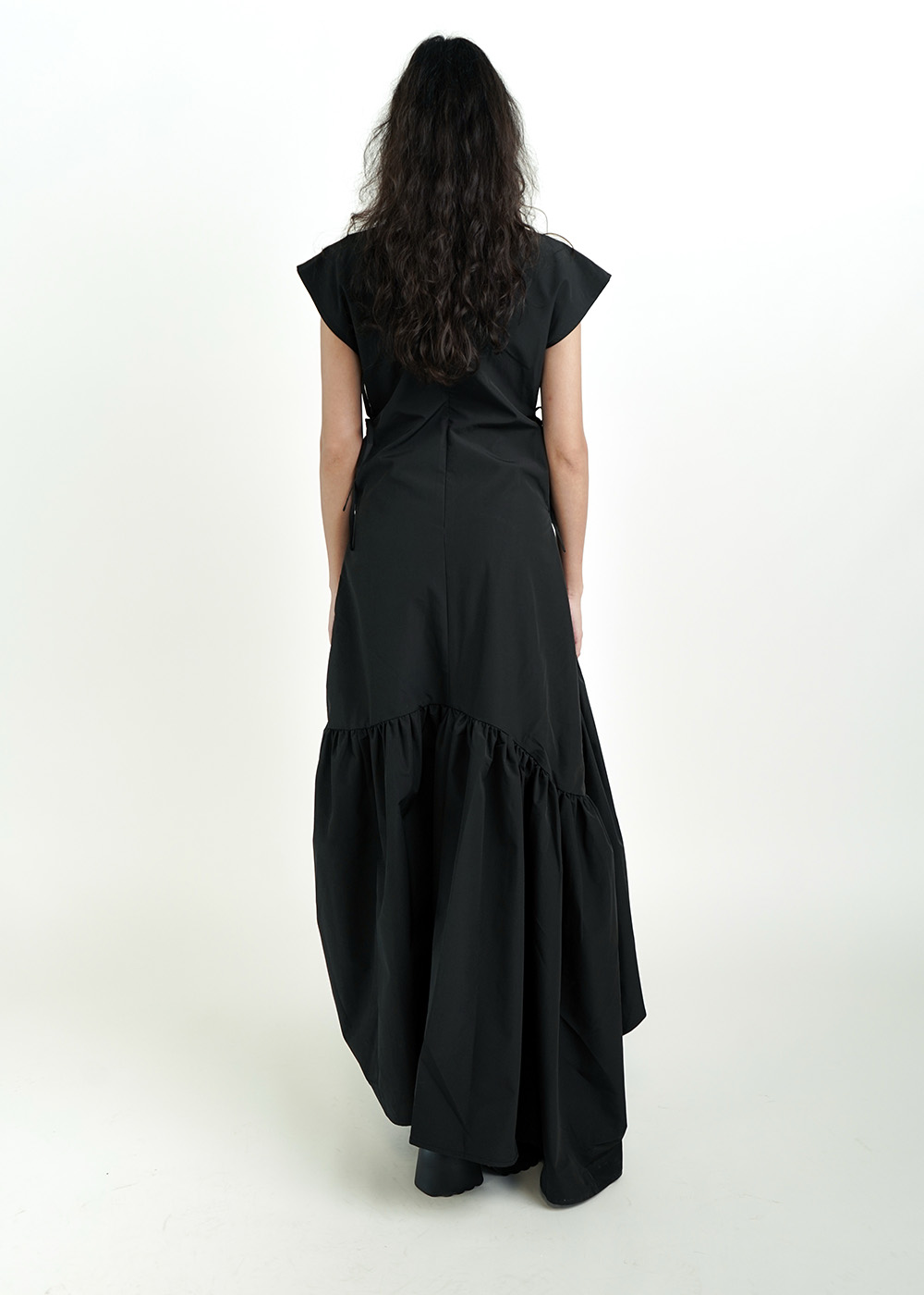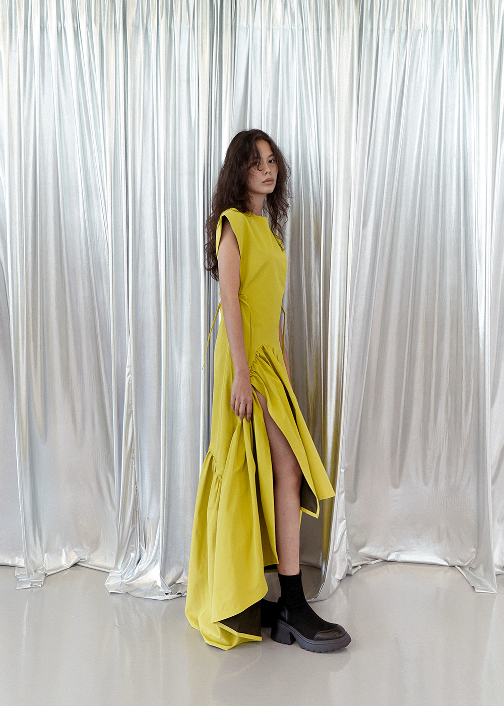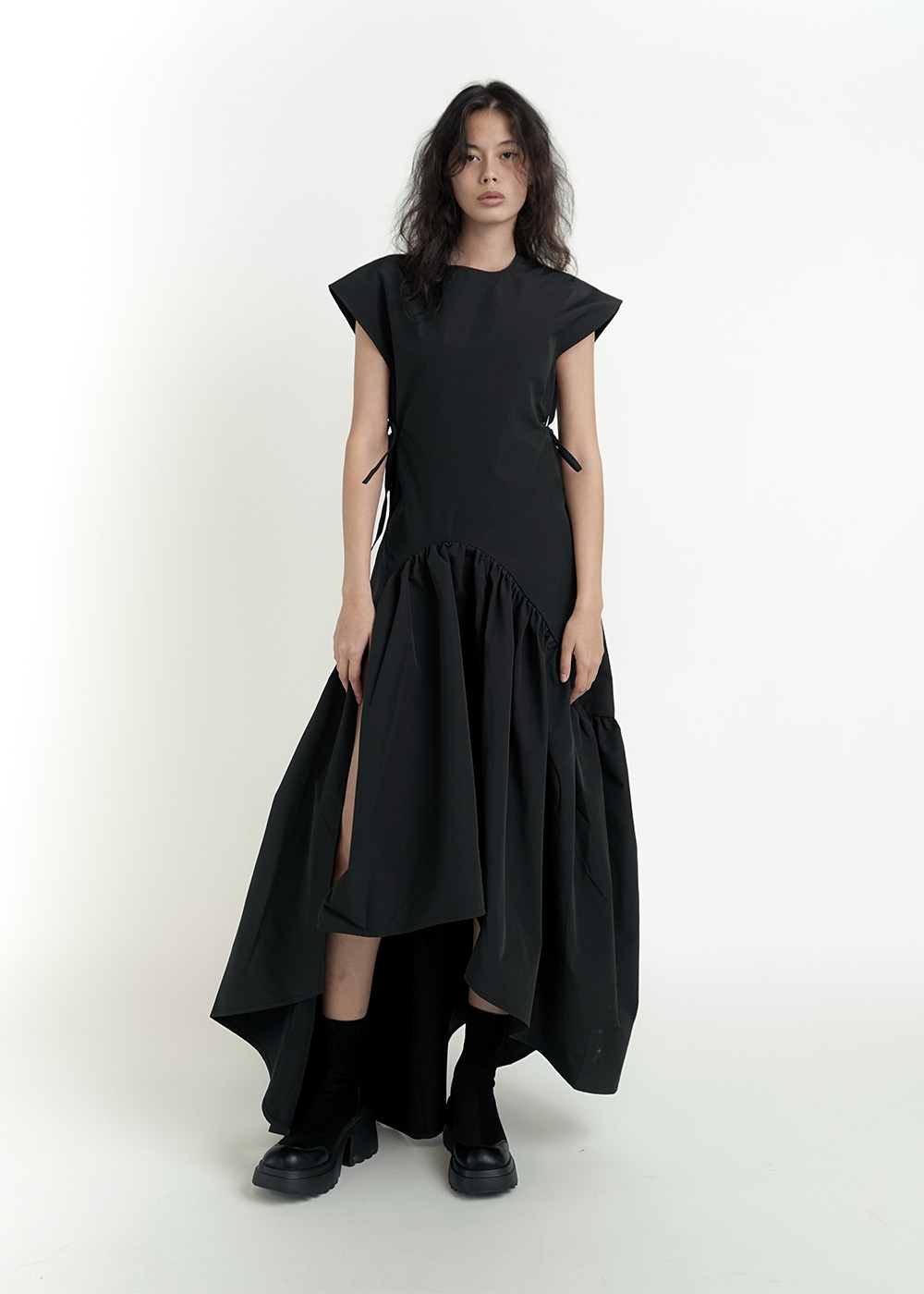 Dramatic asymmetrical hem with high slit for movement and edge Gathered ruched detailing creates a sculptural silhouette Side tie closure for subtle adjustability and fit Sharp structured shoulders balanced with fluid drape ...Read more